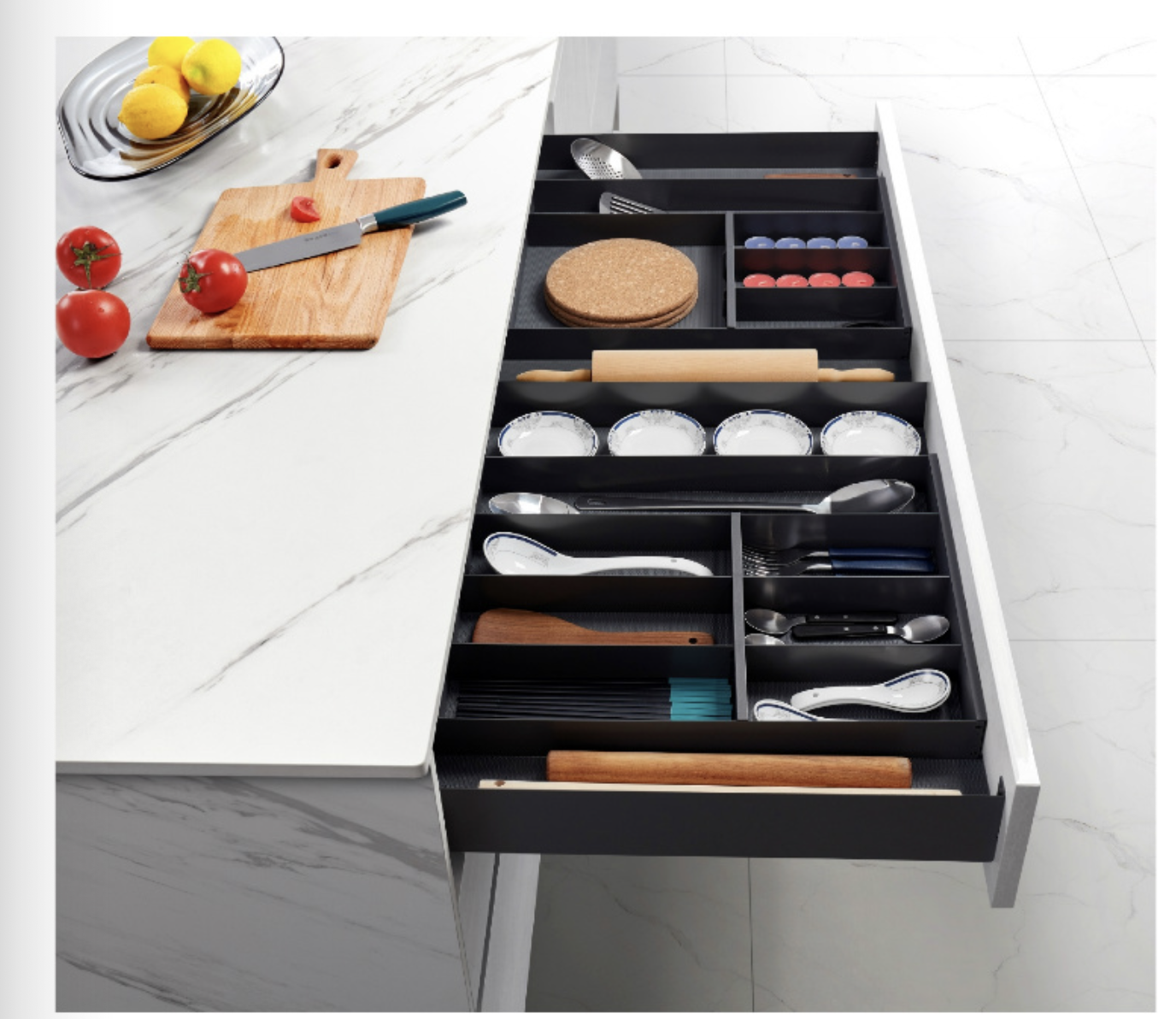 Crafted from solid wood, dovetail drawers are a hallmark of high-quality cabinetry, offering both durability and beauty. For those looking to add a modern touch to their classic kitchen, TAQ incorporates the latest innovative hardware from renowned brands like Blum and DTC. Our hardware and drawer solutions, including slim metal drawers, metal pantry organization baskets, soft-closing mechanisms, and undermount concealed drawer slides, seamlessly blend traditional aesthetics with contemporary functionality.